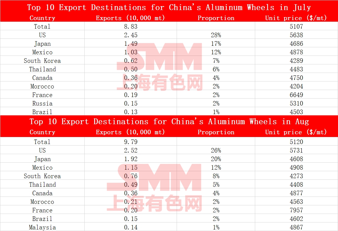In August, China’s aluminum alloy wheel hub exports surged by 9,600 mt to 97,900 mt, up 10.9% MoM and 18.4% YoY, reaching the highest monthly export volume in nearly three years. By export destination, demand from traditional markets such as the US, Japan, and Mexico remained stable in July-August, while the average export price to countries like France saw a notable increase in August. The robust growth in overseas demand significantly boosted production confidence among aluminum wheel hub export enterprises.